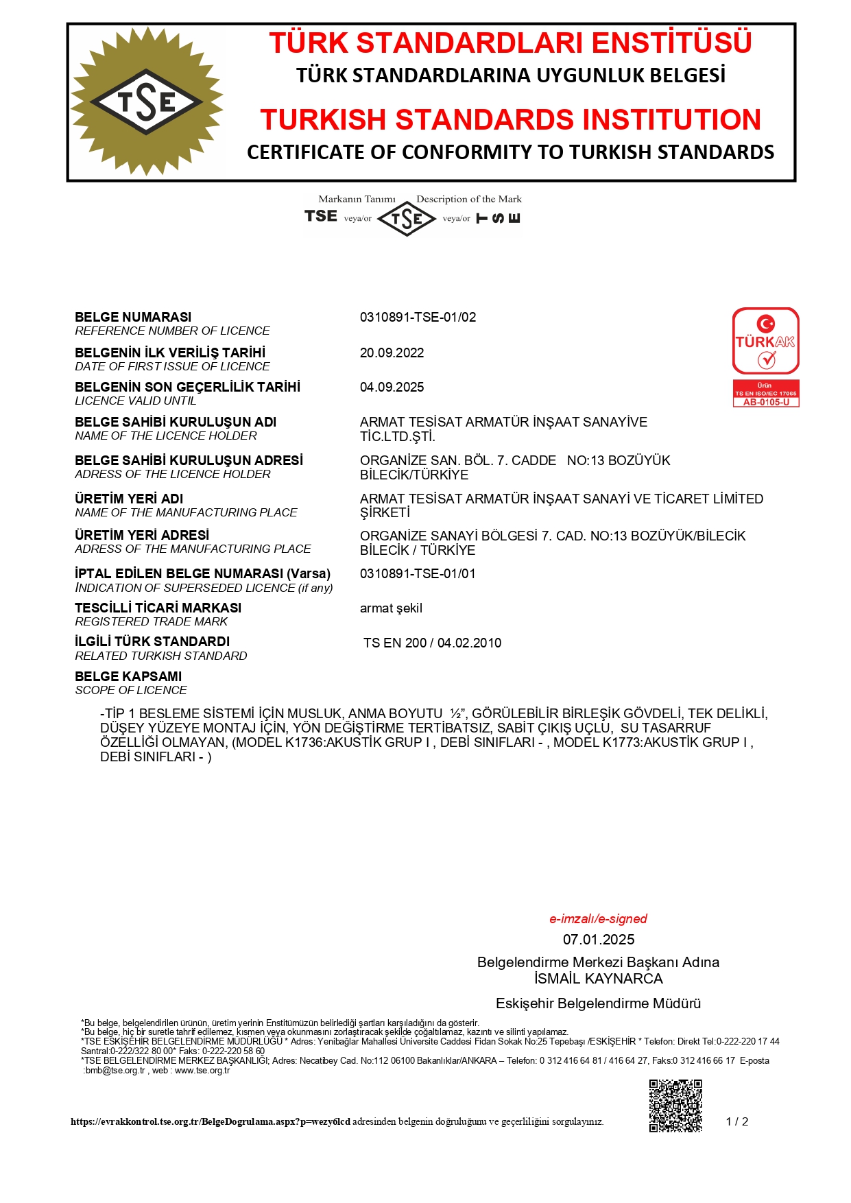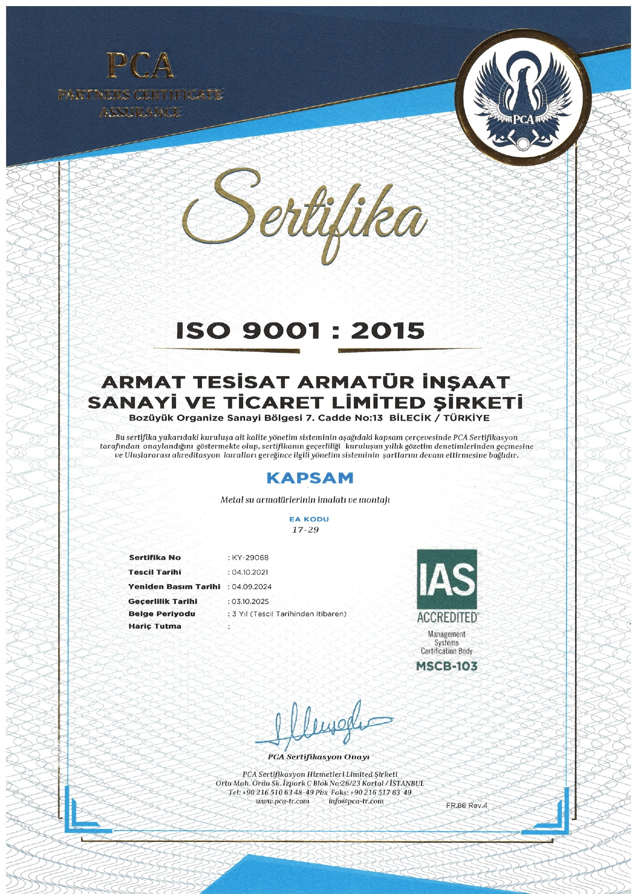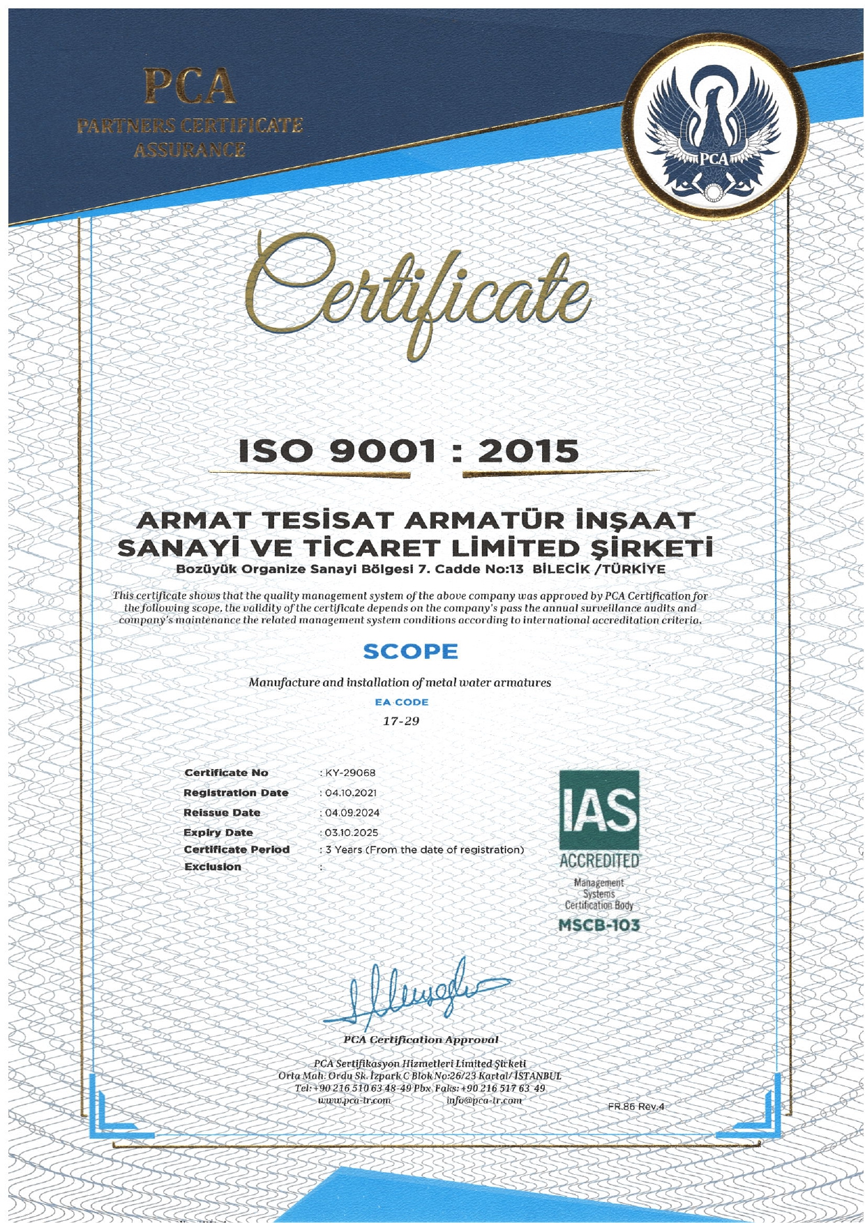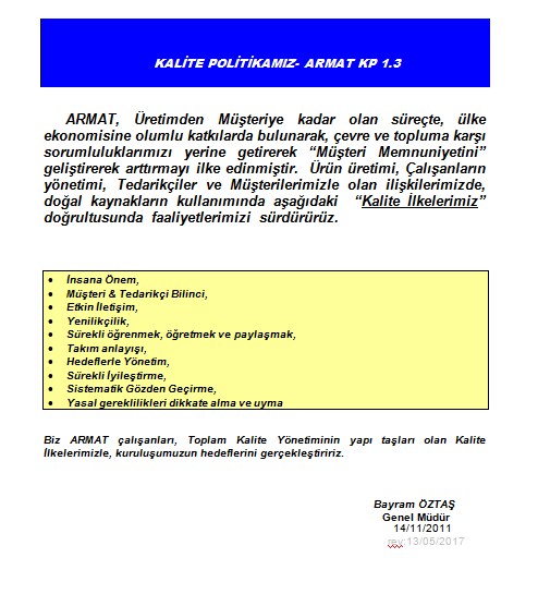 ARMAT ' ta, 2005 yılı Ocak ayı itibariyle kalite sistem çalışmalarına başlanmıştır ve ağustos ayı içinde - TUV NORD CERT - belgelendirme kurulu tarafndan - TS. EN ISO 9001 belgelendirme denetlemesi yapılmış ve denetleme başarıyla tamamlanarak- TS. EN ISO 9001 belgesini almıştır.